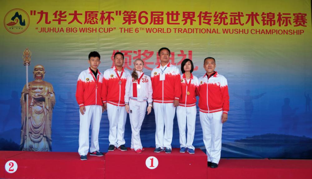 ▲世界传统武术锦标赛上,赵为民与获奖弟子合影留念。
