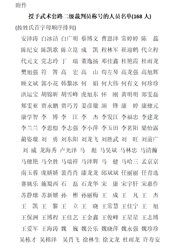 根据国家体育总局武术运动管理中心《武术套路竞赛裁判员管理办法实施细则》(试行)的相关规定和工作要求,我协会于2025年10月2日至5日组织了2025年甘南州武术套路二级裁判员培训认证考试。经考核,王俊峰等168人成绩合格,拟授予武术套路二级裁判员称号。现将拟授予人员名单予以公示(名单详见附件)。